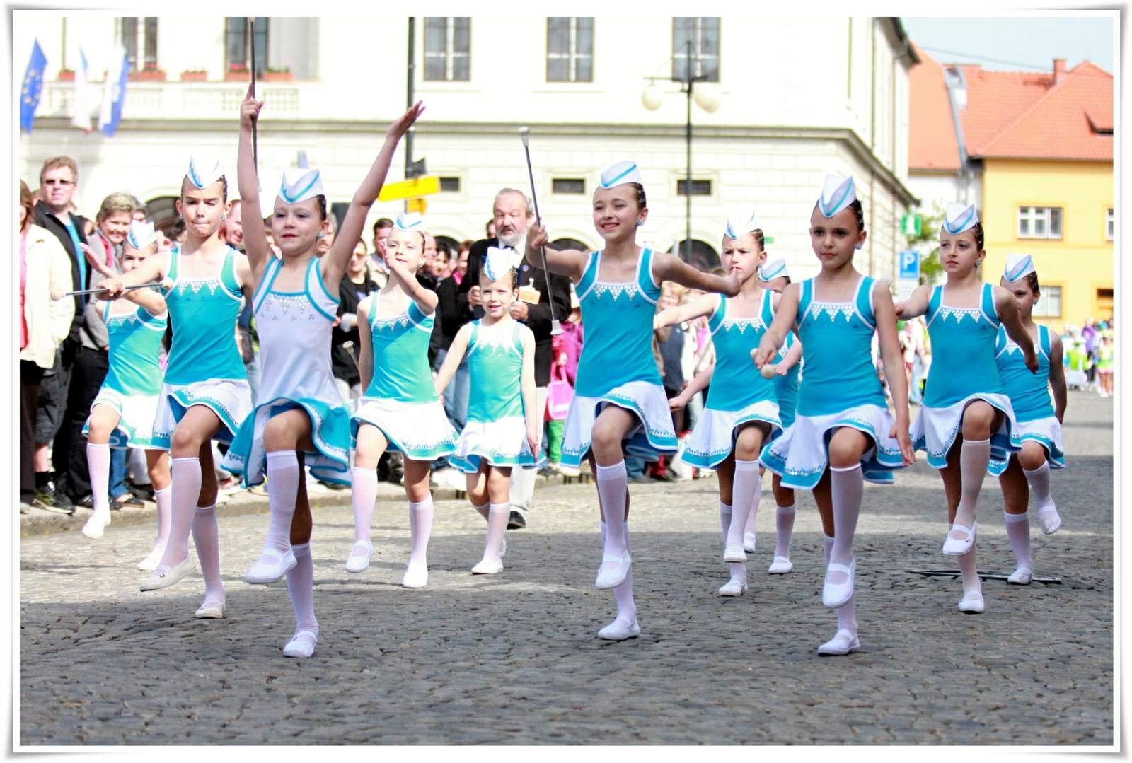 Kostým v bílo-tyrkysové kombinaci doplněný lesklými flitry. Lze kombinovat také s bílým kabátkem.